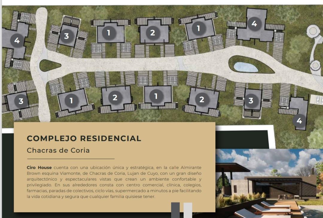 Ciro House cuenta con una ubicación única y estratégica, en la calle Almirante Brown esquina Viamonte, de Chacras de Coria, Lujan de Cuyo, con un gran diseño arquitectónico y espectaculares vistas que crean un ambiente confortable y privilegiado. En sus alrededores consta con centro comercial, clínica, colegios, farmacias, paradas de colectivos, ciclo vías, supermercado a minutos a pie facilitando la vida cotidiana y segura que cualquier familia quisiese tener.